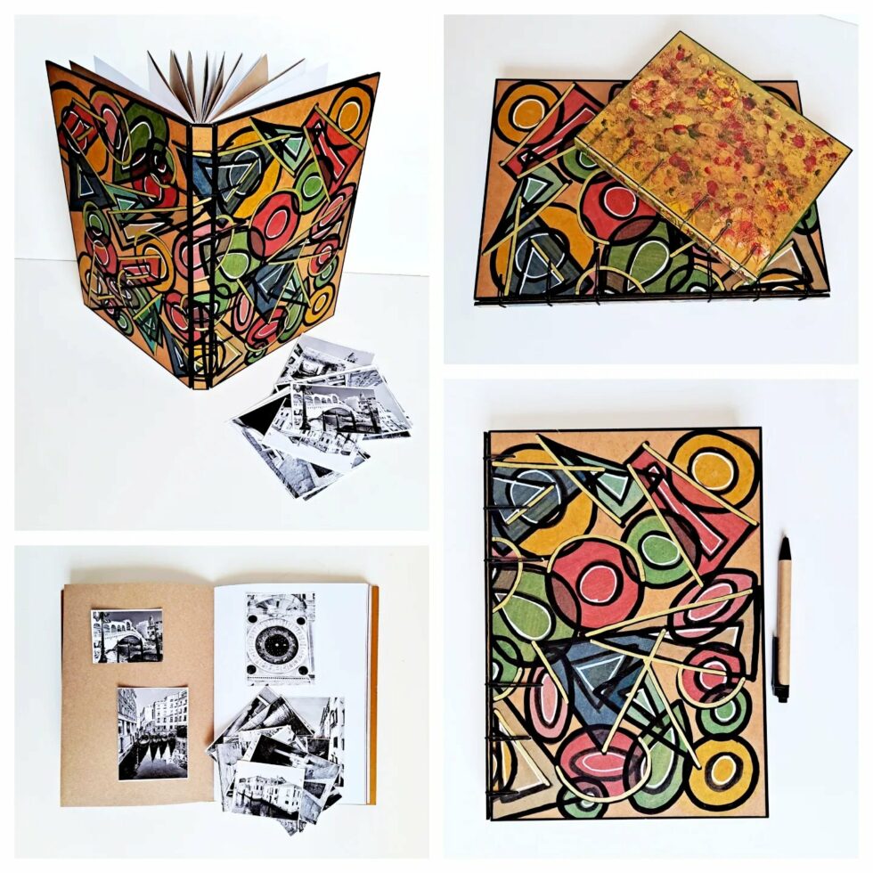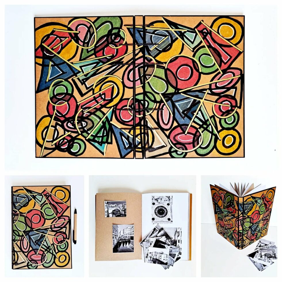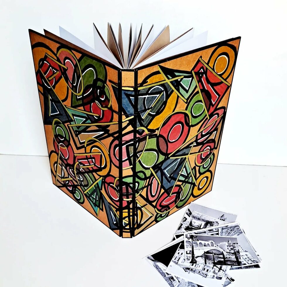Album PANAMA, couverture en bois peint, création motif original peint à la main, grand format A4, 144 pages cousues, papier ocre et blanc en alternance, grammage 160g, reliure secrète Belge.
