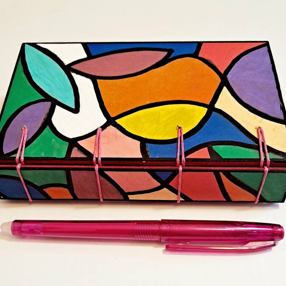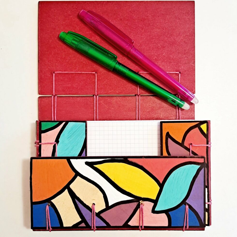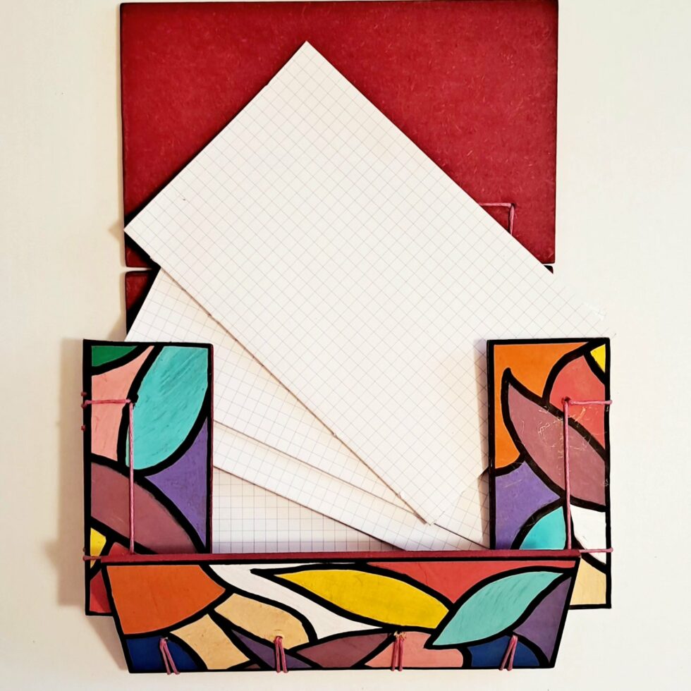 Création Boîte à mots “Art”, création structure en bois, motif original peint à la main, reliure cousue, format A6.