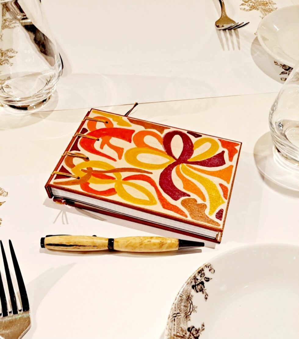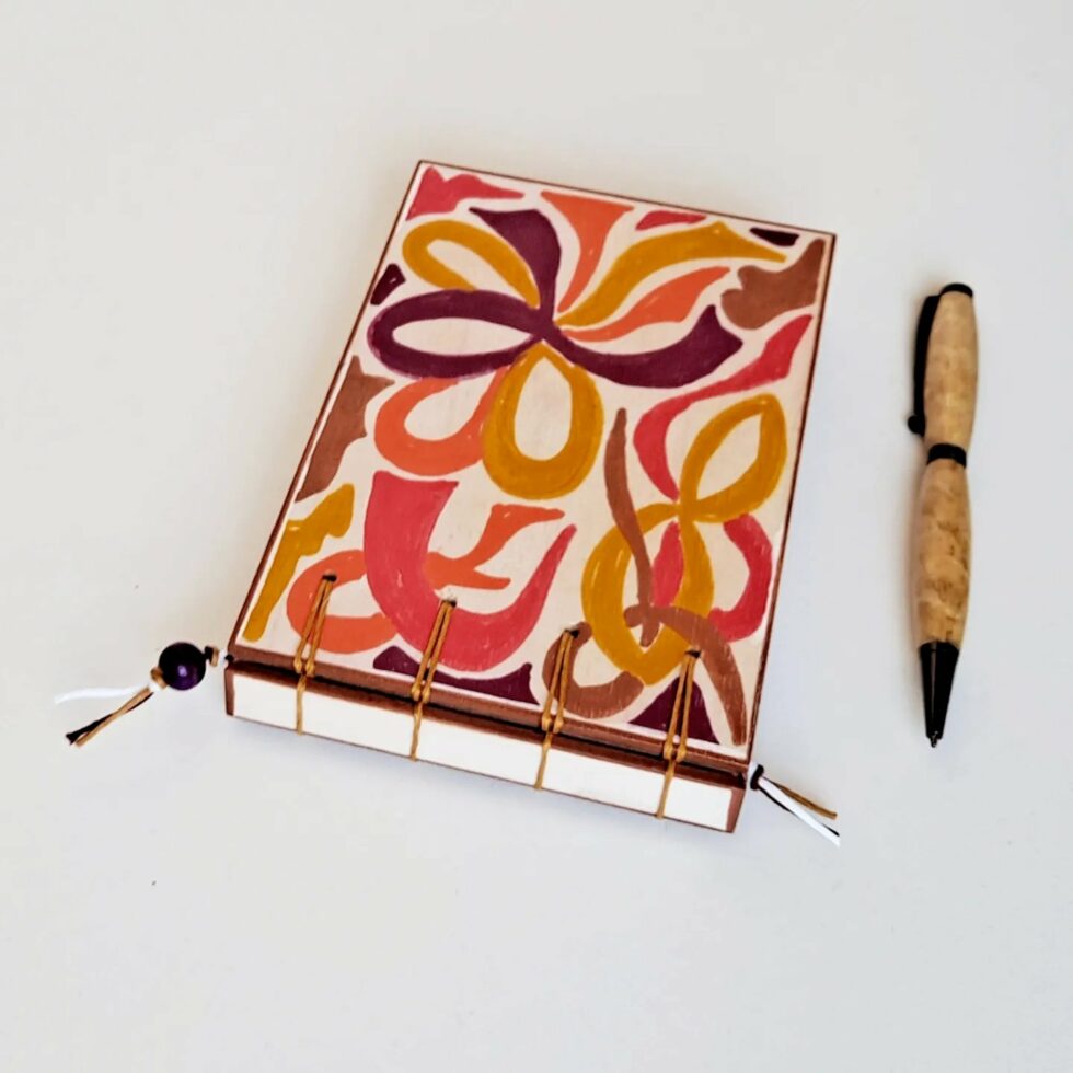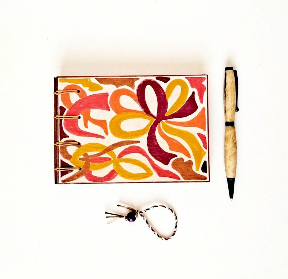 Carnet DÉLICE, couverture en bois peint, création originale motif unique, petit format A6, orientation paysage, 160 pages cousues papier 90g petits-carreaux, reliure Criss-Cross.