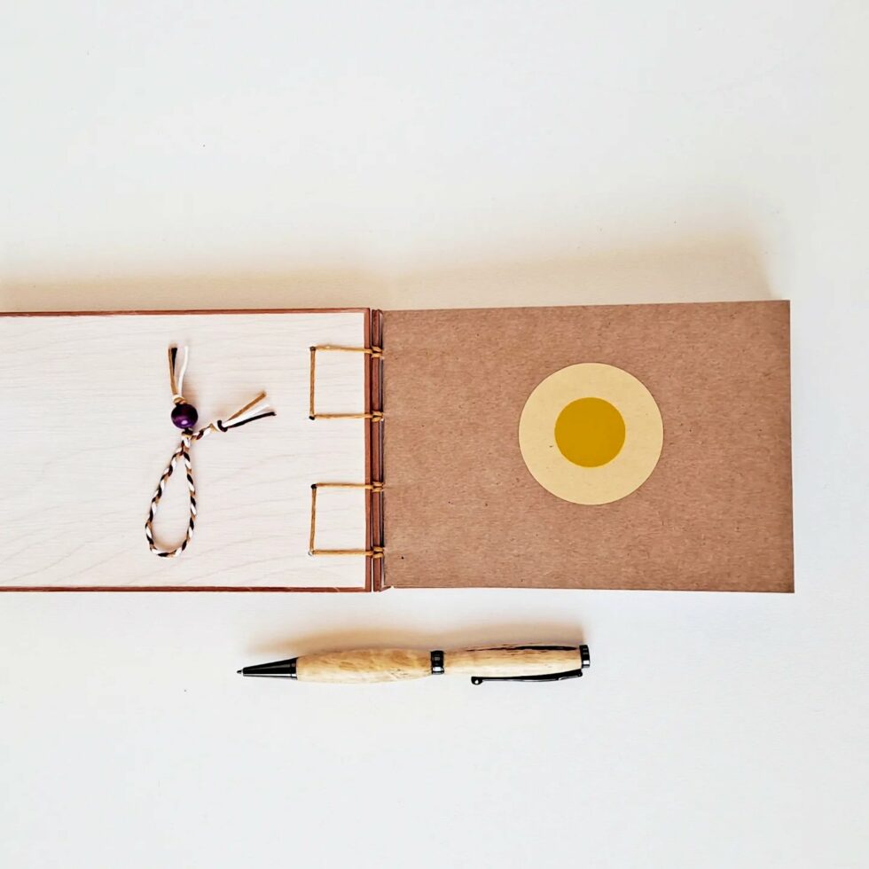 Je choisis des feuilles de bois pour la fabrication de Mes p’tits carnets. Le bois est le matériau le mieux adapté que j’ai trouvé. Il est un bon support pour mes peintures : il ne gondole pas et il ne se craquelle pas. Aussi, il assure une bonne résistance au carnet. J’ai choisi de ne pas utiliser de colle car le collage ne répond pas à mon envie de tendre le plus possible vers une éco-conception de Mes p’tits carnets. De plus, l’utilisation de colle rend plus difficile le processus de recyclage des papiers et des cartons, même à très faible dose. C’est pourquoi la couverture et les pages de Mes p’tits carnets sont 100% cousues !