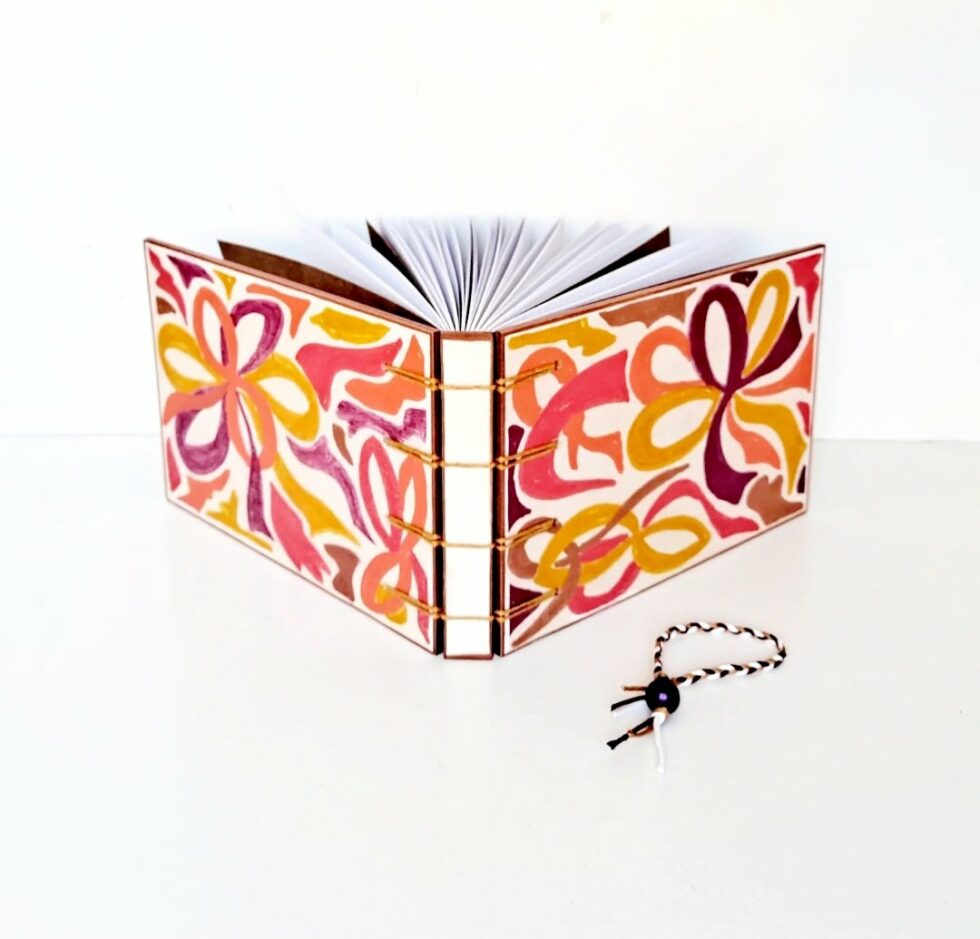 Je couds à la main la reliure de Mes p’tits carnets, elle est apparente à l’extérieur et à l’intérieur du carnet. C’est la reliure secrète belge ou reliure Criss-cross. On doit cette technique à Anne Goy. Cette reliure est l’assemblage des 3 parties de la couverture (recto, dos, verso) par une couture entrecroisée. Le résultat à la fois solide et esthétique. Elle permet une ouverture à plat du carnet. Les points de perçage de la reliure varient en nombre et en distance pour créer des variantes et la couleur du fil s’harmonise avec le motif peint.