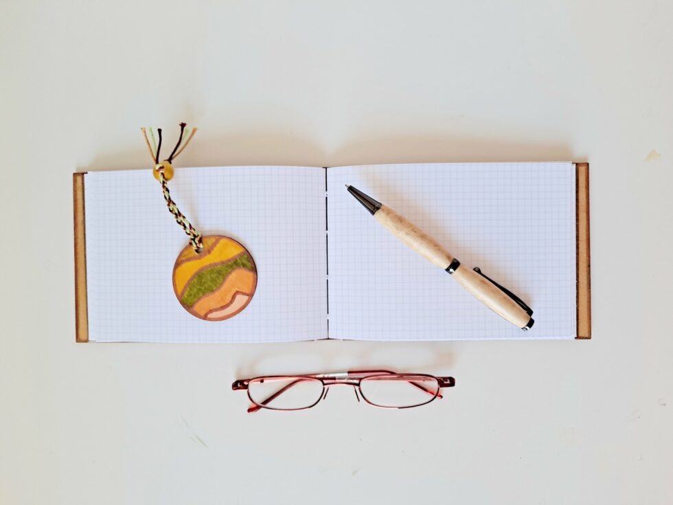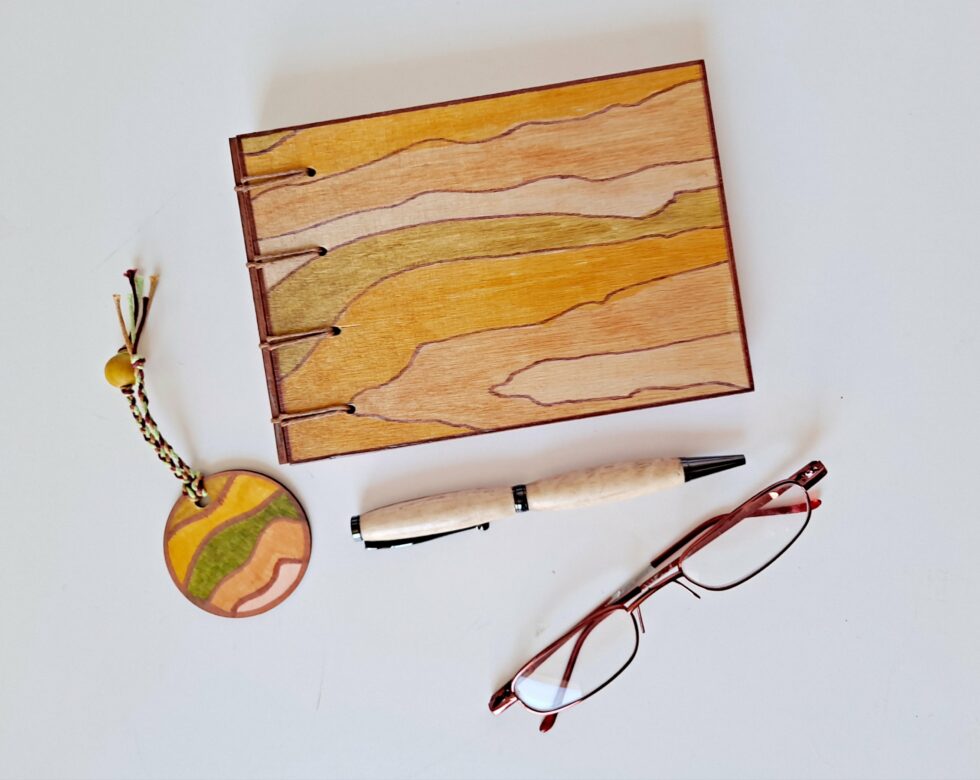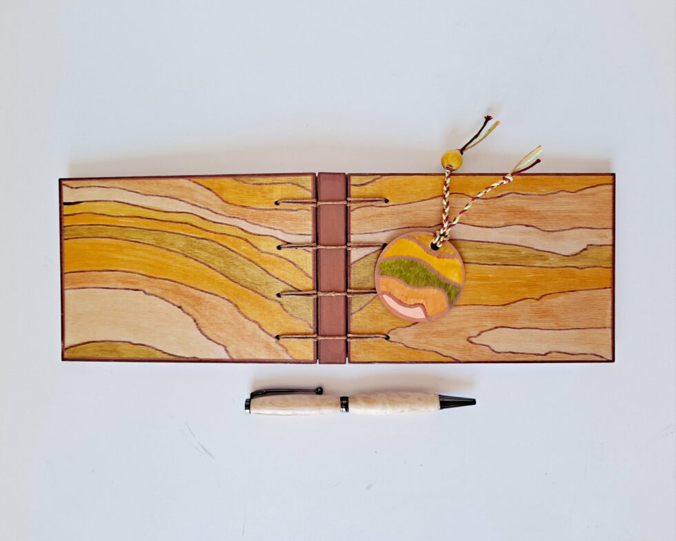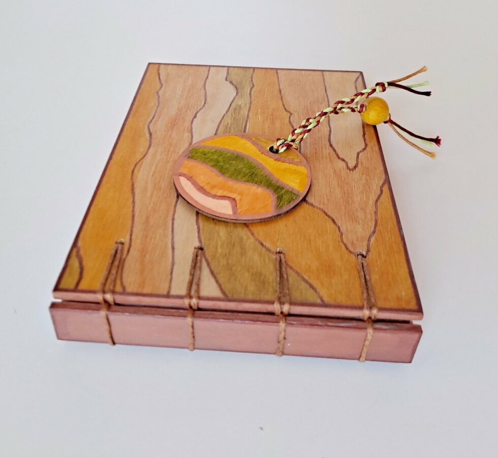 La création de carnets en bois et papier selon la méthode de la reliure criss-cross est un processus méticuleux qui exige une attention particulière aux détails et un savoir-faire artisanal. J’attache une grande importance au choix des matériaux. Une fois le bois sélectionné, je dessine et peins des motifs uniques sur la couverture du carnet.