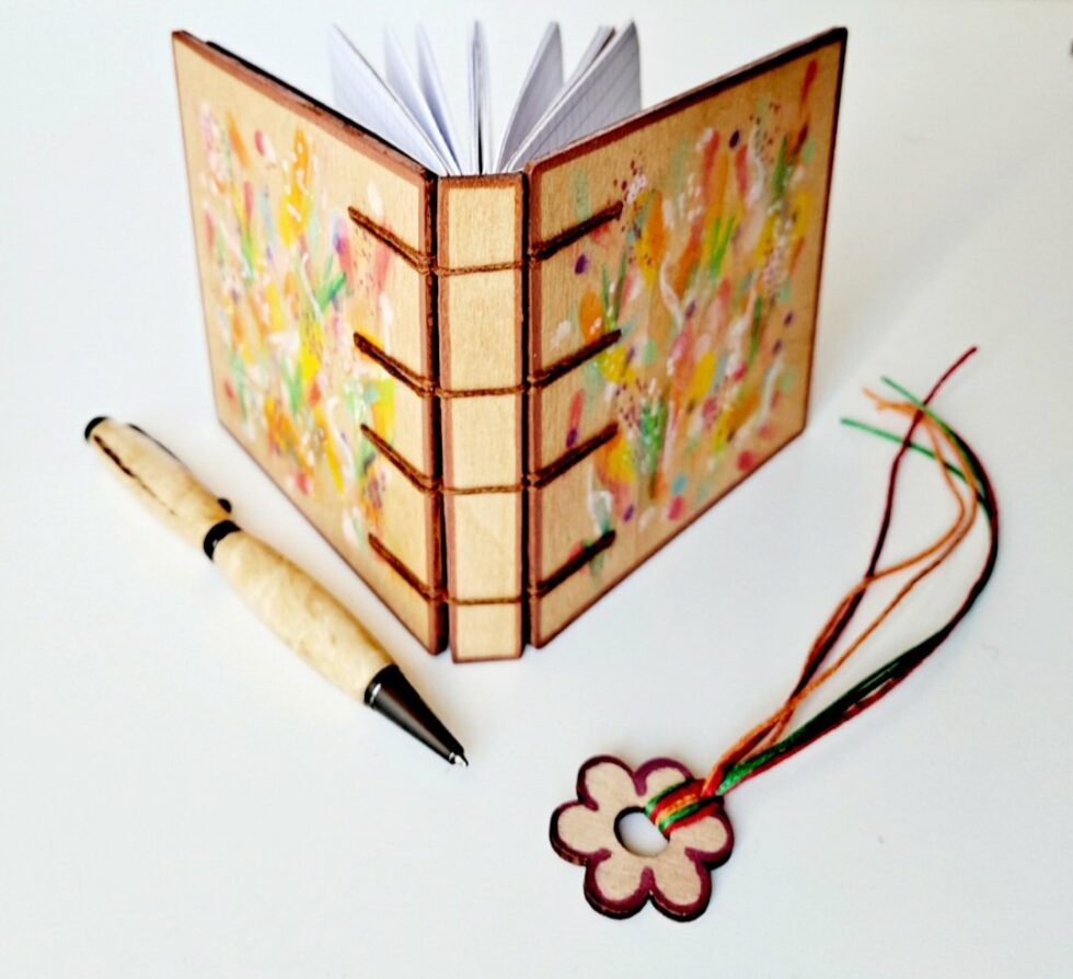 Carnet FRED, couverture en bois peint, motif original peint à la main, petit format A7 (10×10×2 cm), 128 pages cousues, papier 90g petits carreaux, reliure Criss-Cross.