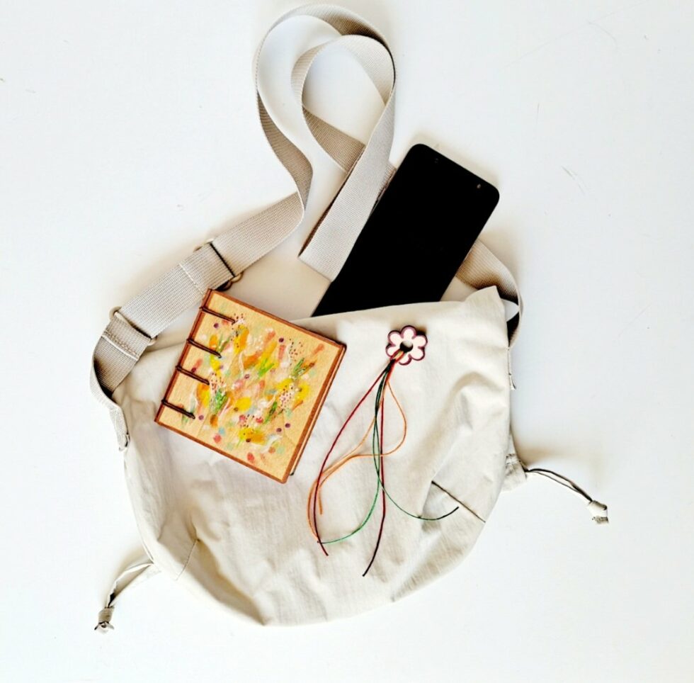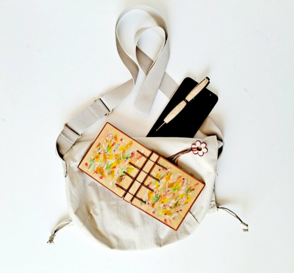 Je choisis des feuilles de bois pour la fabrication de Mes p’tits carnets. Le bois est le matériau le mieux adapté comme support pour mes peintures : il ne gondole pas et il ne se craquelle pas. Aussi, il assure une bonne résistance au carnet. J’ai choisi de ne pas utiliser de colle car le collage ne répond pas à mon envie de tendre vers l’éco-conception de Mes p’tits carnets. De plus, l’utilisation de colle rend plus difficile le processus de recyclage, même à très faible dose. C’est pourquoi la couverture et les pages de Mes p’tits carnets sont 100% cousues !