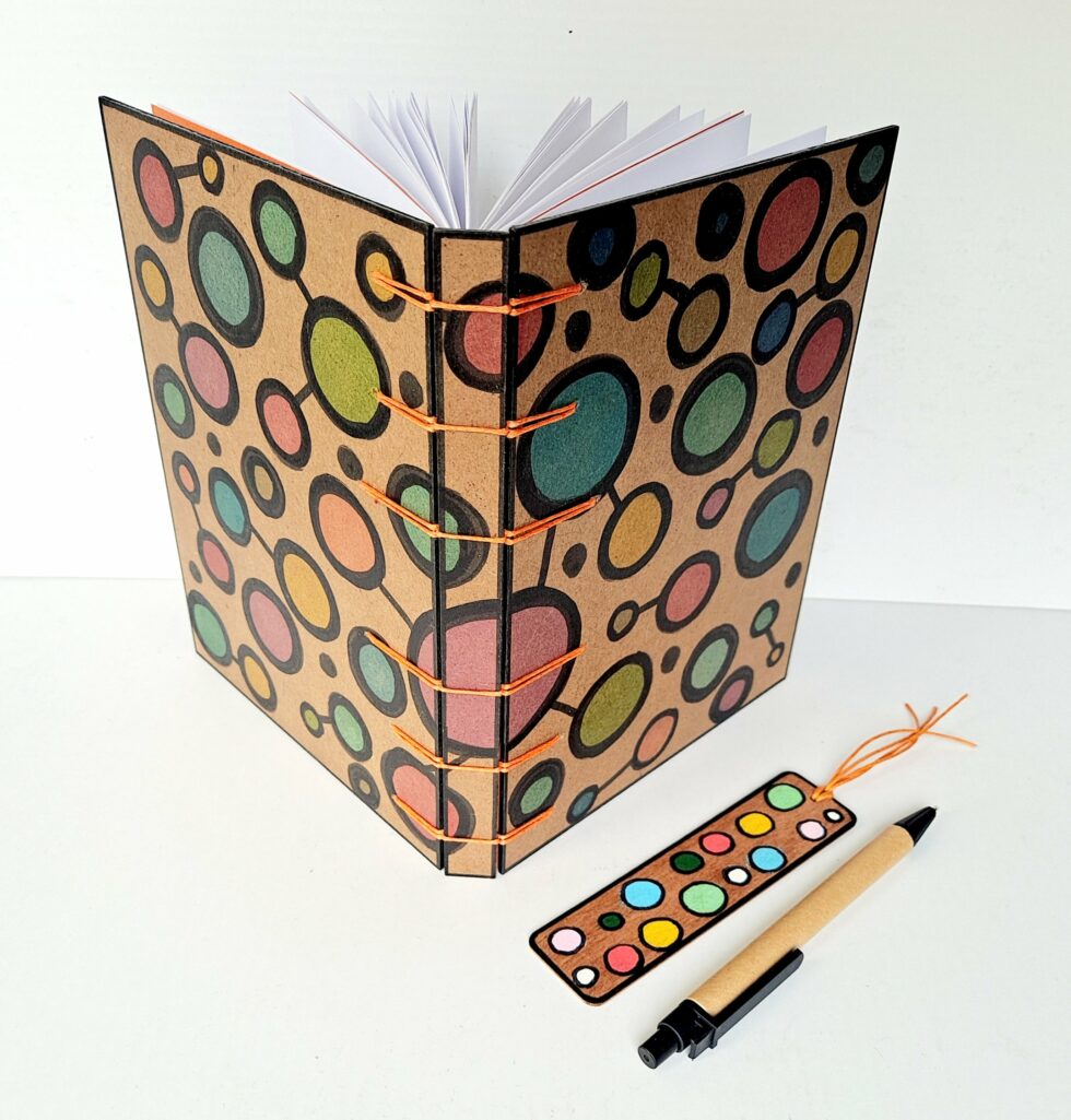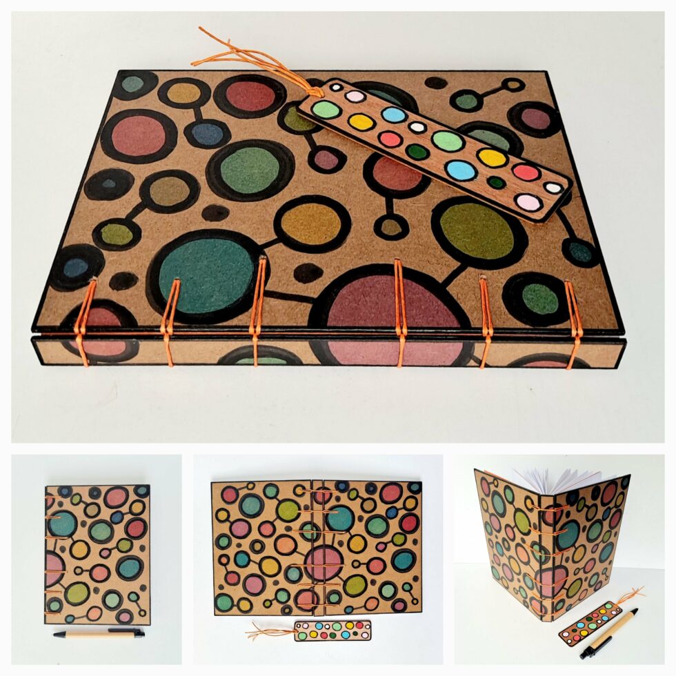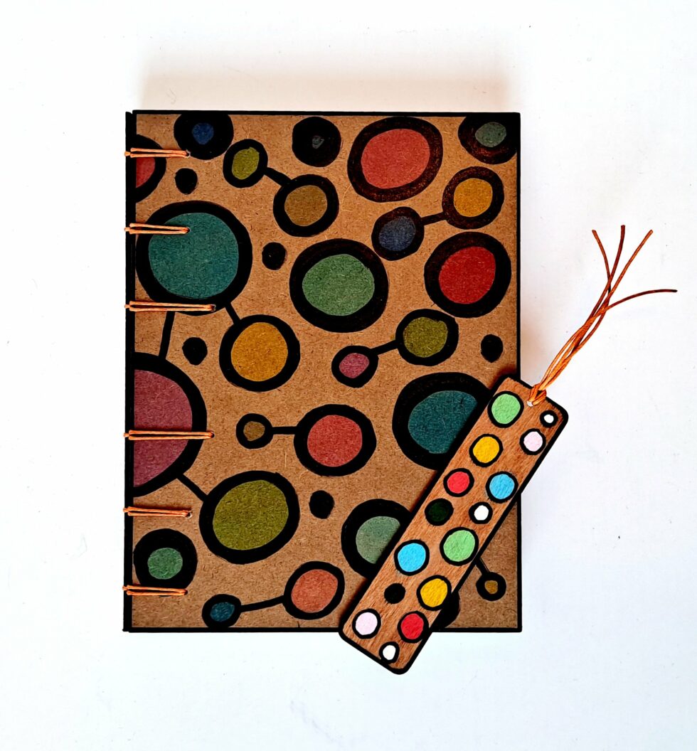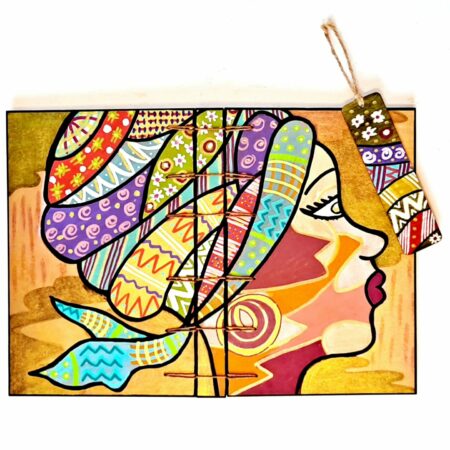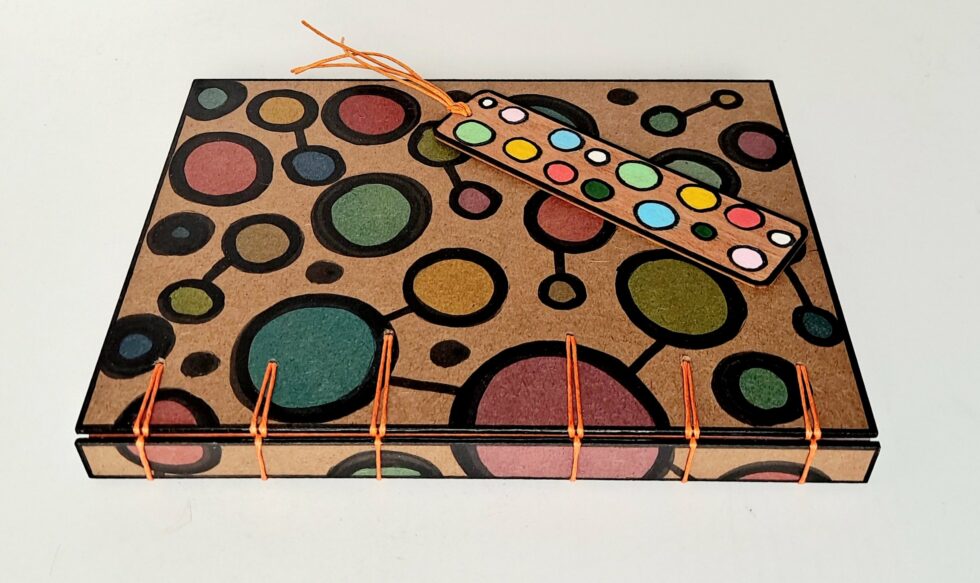 Carnet “Hari”, couverture en bois peint, création motif original peint à la main, format A5, 144 pages cousues, papier blanc uni 100g, reliure secrète Belge.
