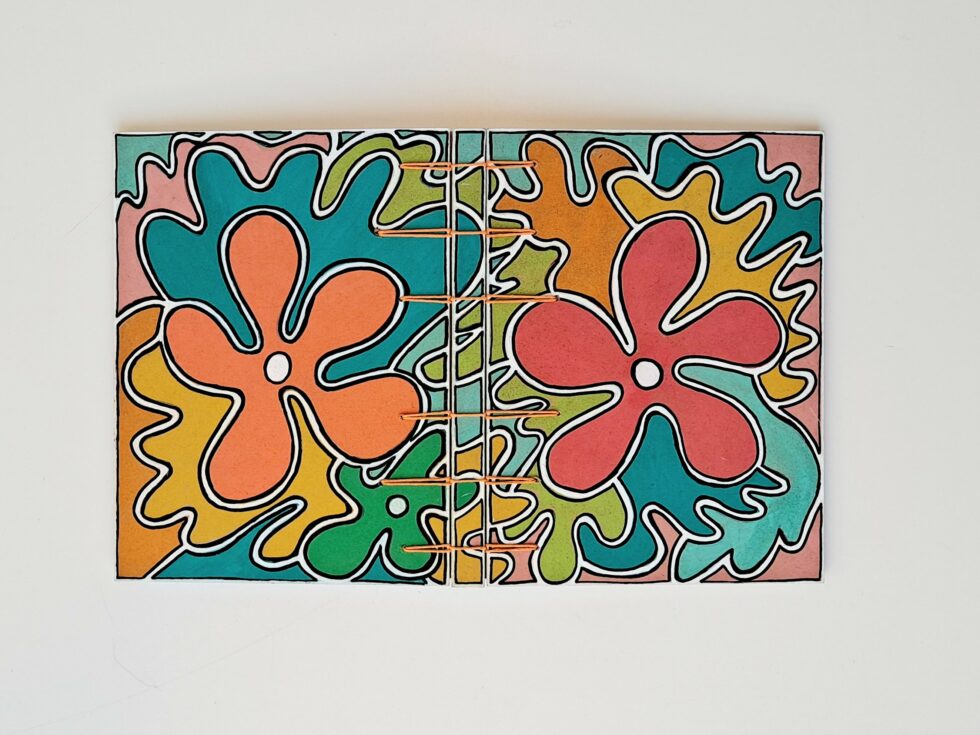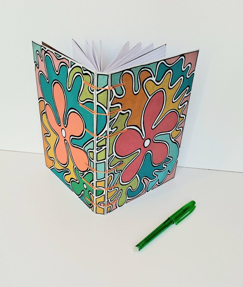 La reliure de Mes p’tits carnets personnalisés est cousue main, elle est apparente à l’extérieur et à l’intérieur du carnet, c’est une reliure appelée reliure secrète belge ou encore reliure Criss-cross, technique inventée en 1985 par Anne Goy. Cette reliure est l’assemblage des 3 parties de la couverture (recto, dos, verso) par une couture entrecroisée qui donne un résultat à la fois solide et esthétique et permet une ouverture à plat du carnet. Les points de perçage de la reliure peuvent varier en nombre et en distance pour créer des variantes et la couleur du fil s’harmonise avec le motif peint.