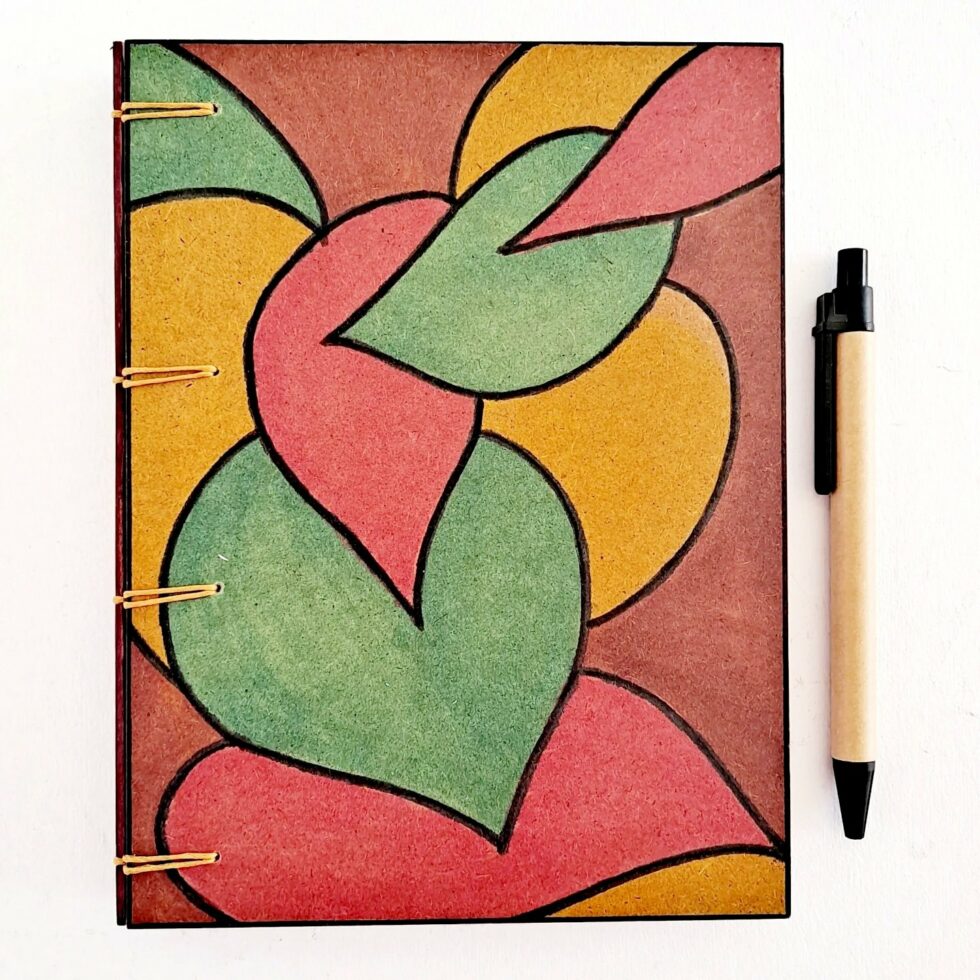 Je choisis des feuilles de bois pour la fabrication de Mes p’tits carnets. Le bois est le matériau le mieux adapté que j’ai trouvé. Il est un bon support pour mes peintures : il ne gondole pas et il ne se craquelle pas. Aussi, il assure une bonne résistance au carnet. J’ai choisi de ne pas utiliser de colle car le collage ne répond pas à mon envie de tendre le plus possible vers une éco-conception de Mes p’tits carnets. De plus, l’utilisation de colle rend plus difficile le processus de recyclage des papiers et des cartons, même à très faible dose. C’est pourquoi la couverture et les pages de Mes p’tits carnets sont 100% cousues !