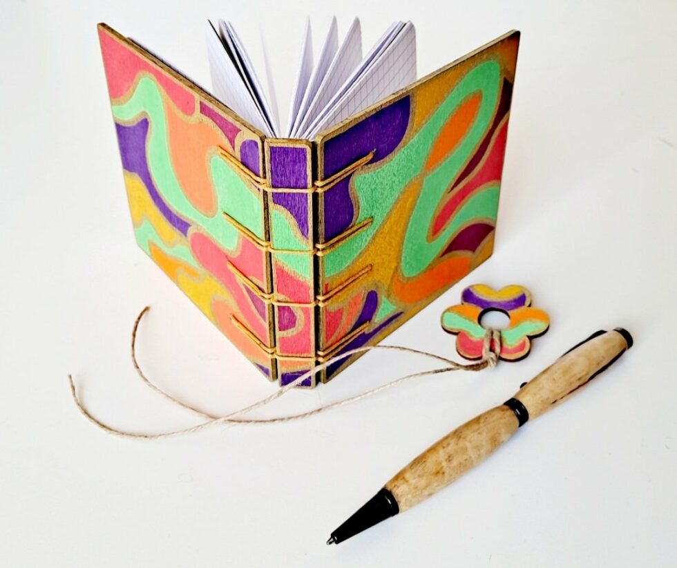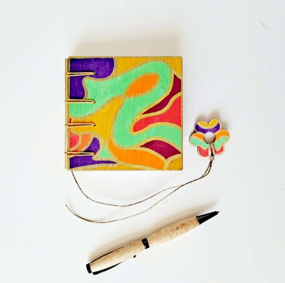 Petit Carnet LUX, couverture en bois peint, format A7 (10×10 cm), motif original peint à la main, 128 pages cousues, papier 90g petits carreaux, reliure Criss-Cross.