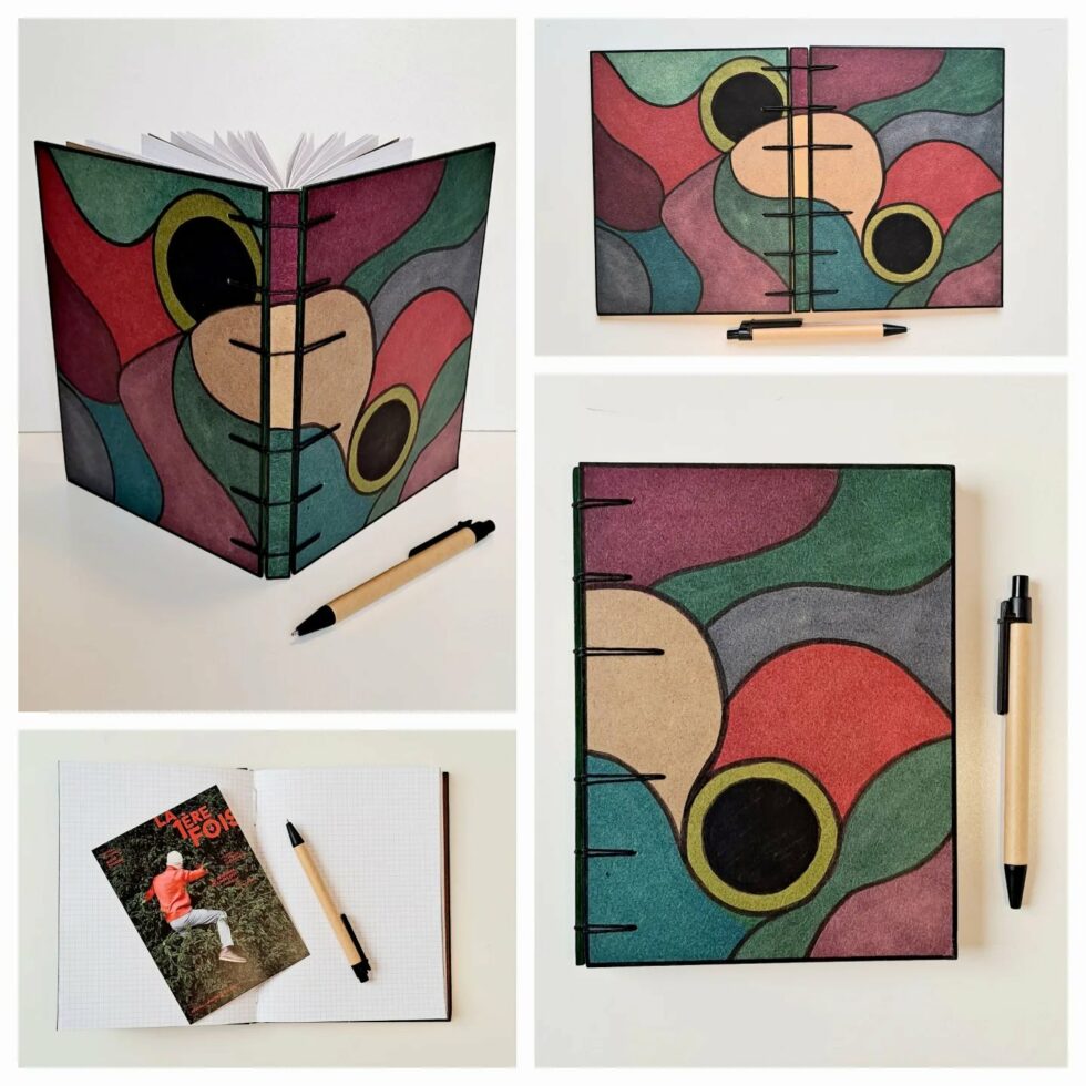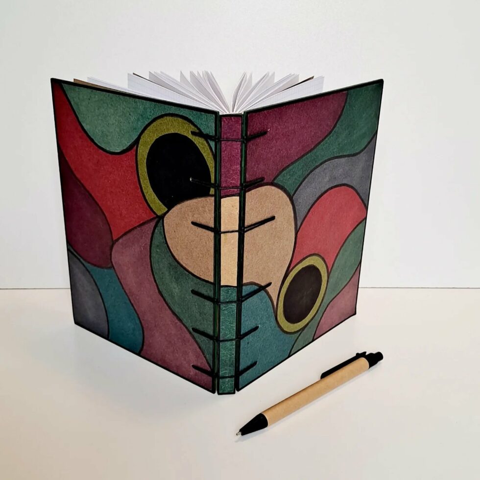 Carnet “Malo”, couverture en bois peint, création motif original peint à la main, format A5, 160 pages cousues, papier petits-carreaux 90g, reliure secrète Belge.