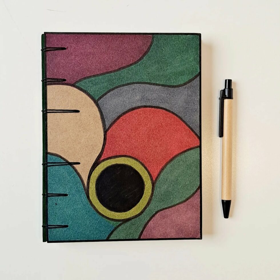 J’ai opté pour des feuilles de bois dans la fabrication de Mes p’tits carnets car c’est le matériau le mieux adapté que j’ai trouvé pour être à la fois le support de mes peintures sans gondoler, se craqueler ou s’écailler et pour assurer une bonne résistance au carnet. J’ai choisi de ne pas utiliser de colle car le collage ne répond pas à mon envie de tendre le plus possible vers une éco-conception de Mes p’tits carnets et complexifie le processus de recyclage des papiers et des cartons, même à très faible dose. C’est pourquoi la couverture et les pages de Mes p’tits carnets sont 100% cousues !