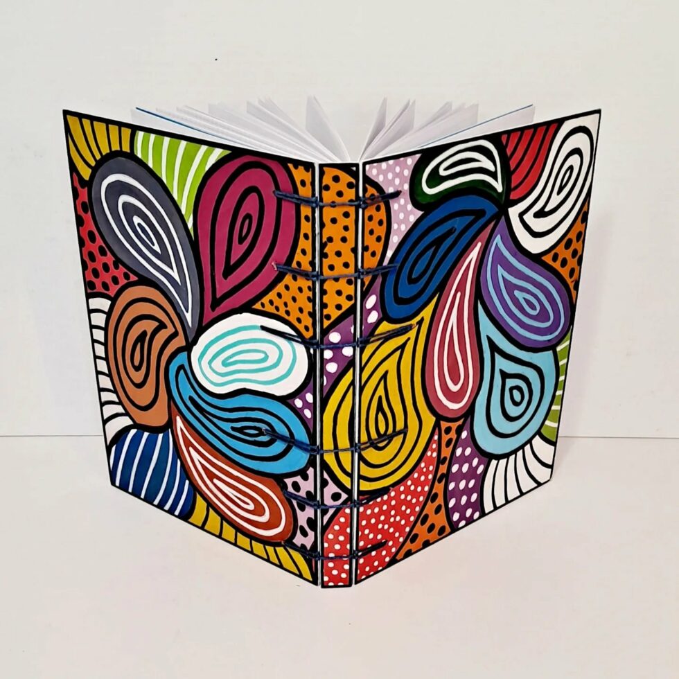 La reliure de Mes p’tits carnets personnalisés est cousue main, elle est apparente à l’extérieur et à l’intérieur du carnet, c’est une reliure appelée reliure secrète belge ou encore reliure Criss-cross, technique inventée en 1985 par Anne Goy. Cette reliure est l’assemblage des 3 parties de la couverture (recto, dos, verso) par une couture entrecroisée qui donne un résultat à la fois solide et esthétique et permet une ouverture à plat du carnet. Les points de perçage de la reliure peuvent varier en nombre et en distance pour créer des variantes et la couleur du fil s’harmonise avec le motif peint.