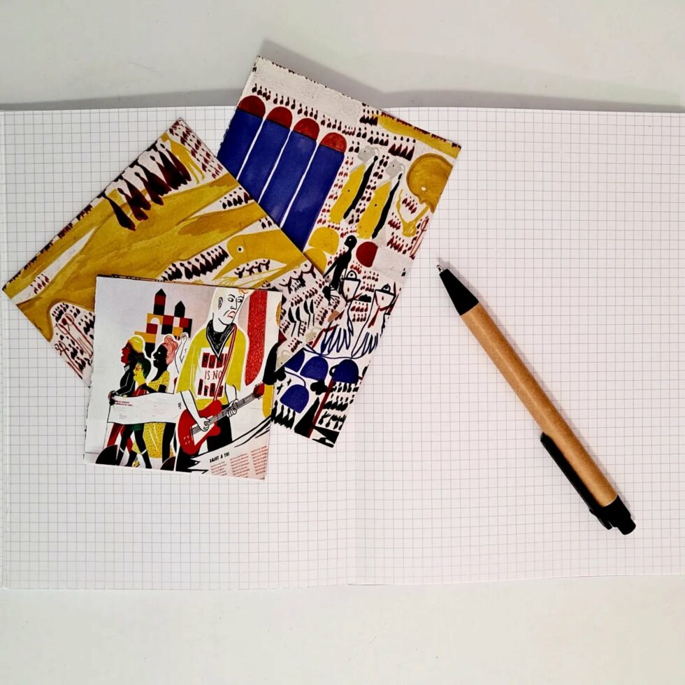 J’ai opté pour des feuilles de bois dans la fabrication de Mes p’tits carnets car c’est le matériau le mieux adapté que j’ai trouvé pour être à la fois le support de mes peintures sans gondoler, se craqueler ou s’écailler et pour assurer une bonne résistance au carnet. J’ai choisi de ne pas utiliser de colle car le collage ne répond pas à mon envie de tendre le plus possible vers une éco-conception de Mes p’tits carnets et complexifie le processus de recyclage des papiers et des cartons, même à très faible dose. C’est pourquoi la couverture et les pages de Mes p’tits carnets sont 100% cousues !