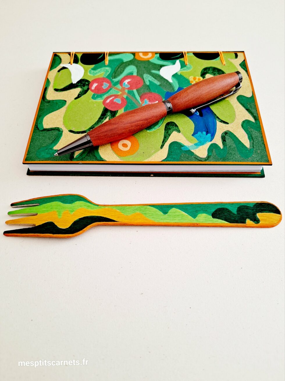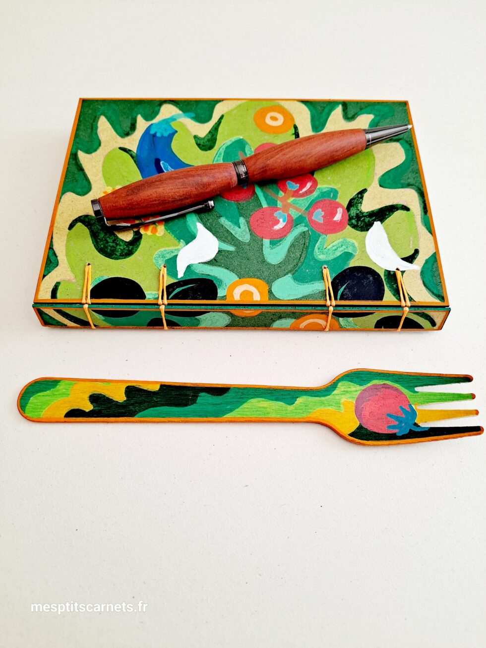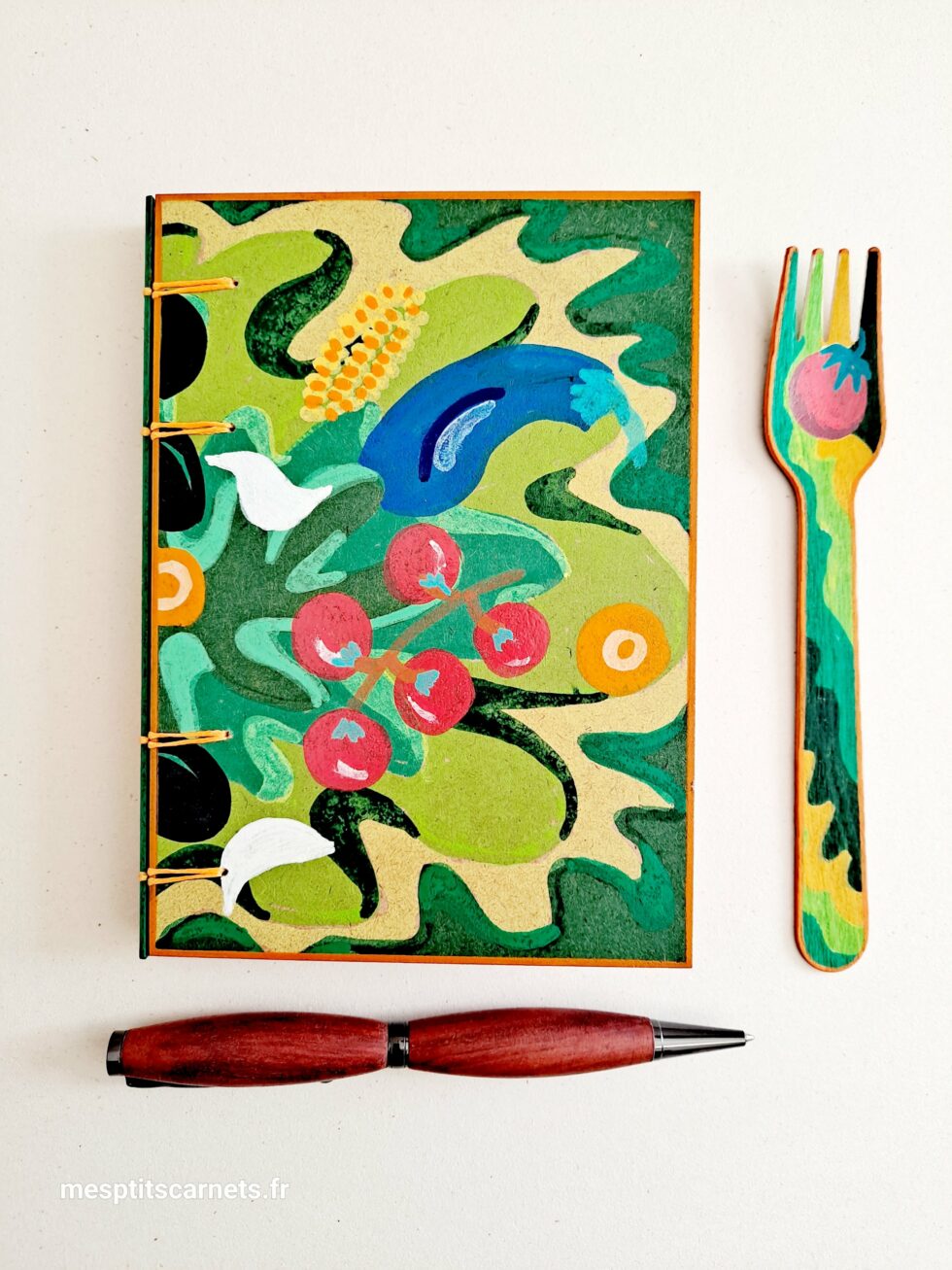 Carnet TOMATES et son marque-pages assorti, format A6, couverture en bois peint à la main, reliure secrète Belge, 96 pages, papier blanc 120g.