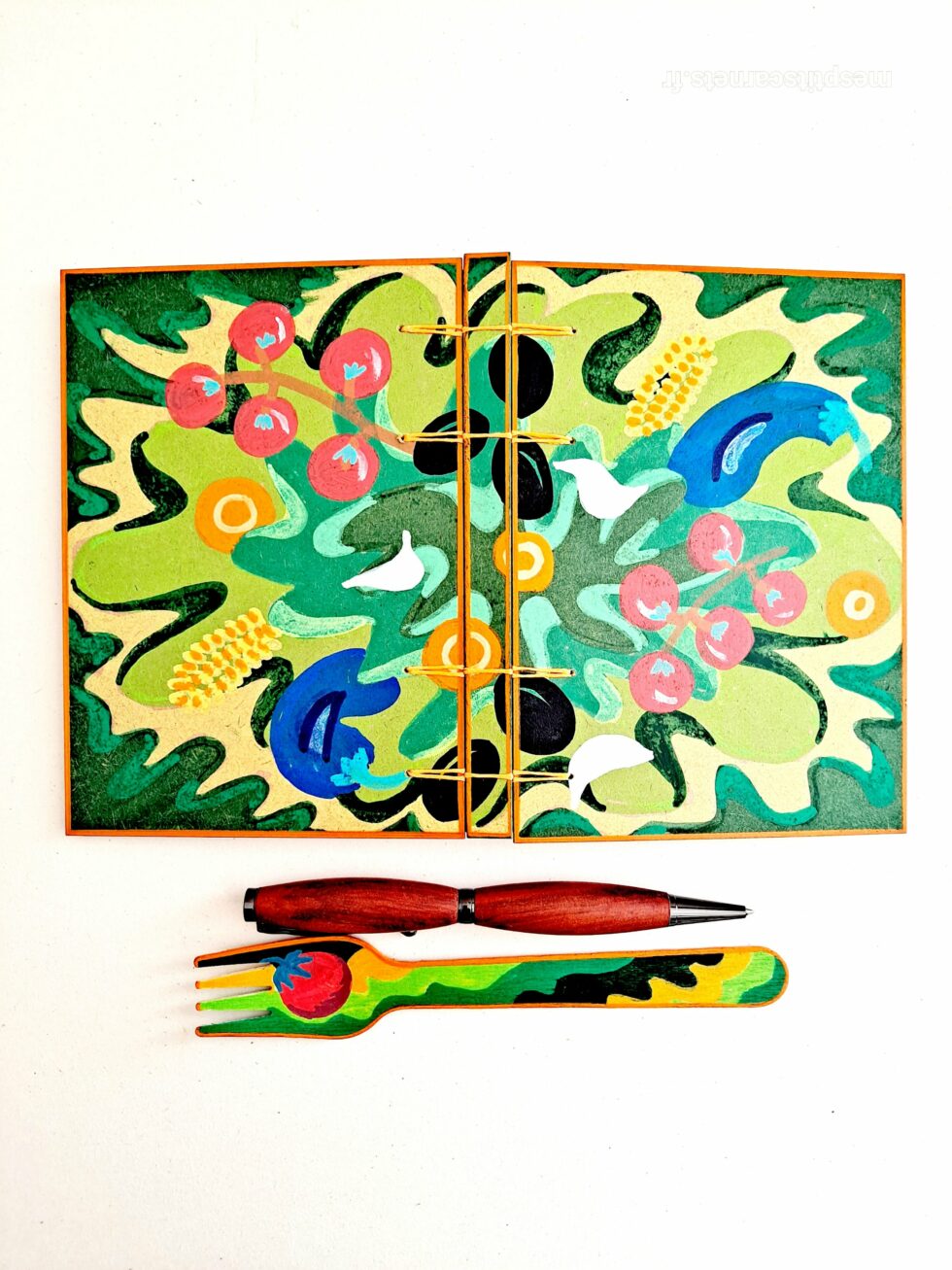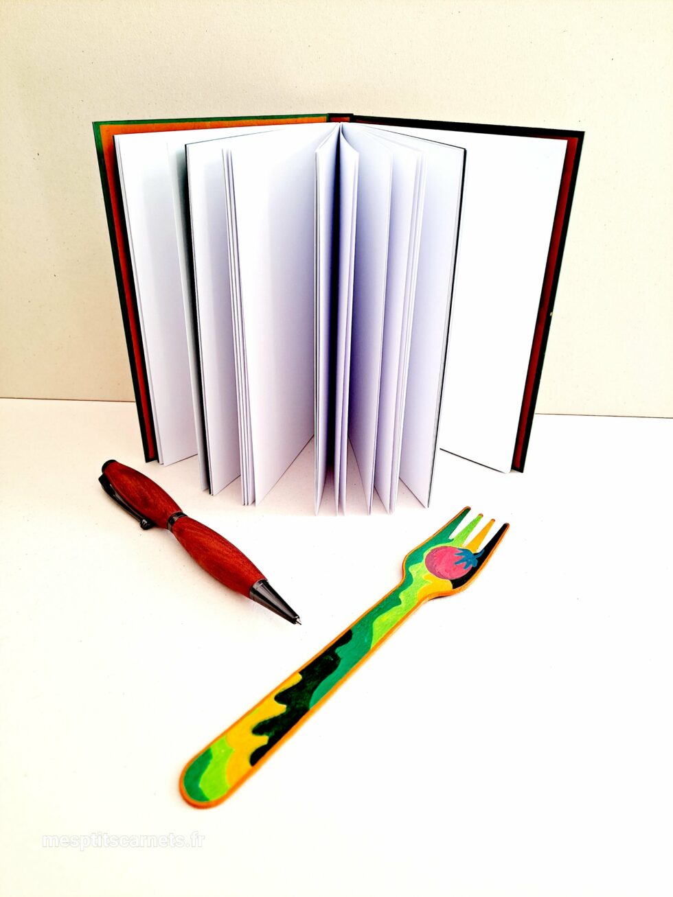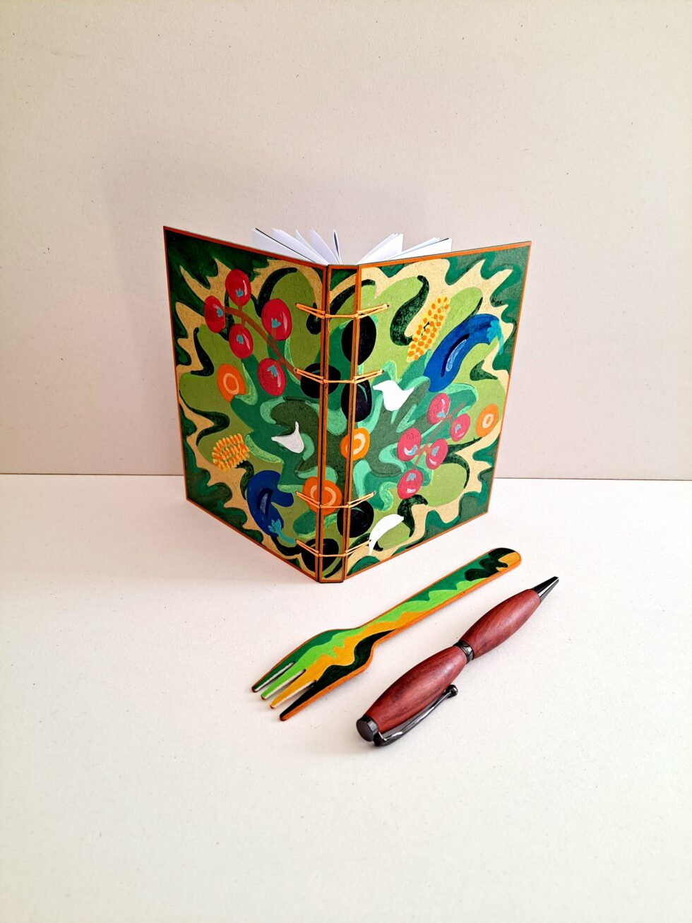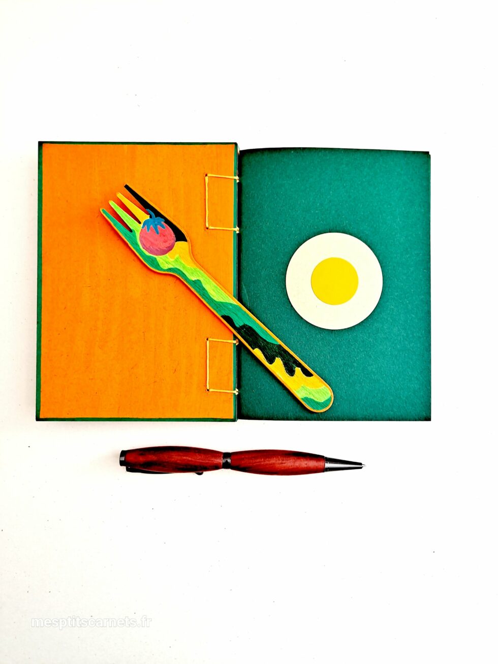 Carnet TOMATES et son marque-pages assorti, format A6, couverture en bois peint à la main, reliure secrète Belge, 96 pages, papier blanc 120g.