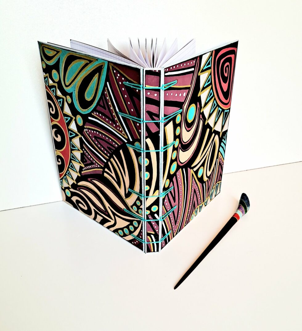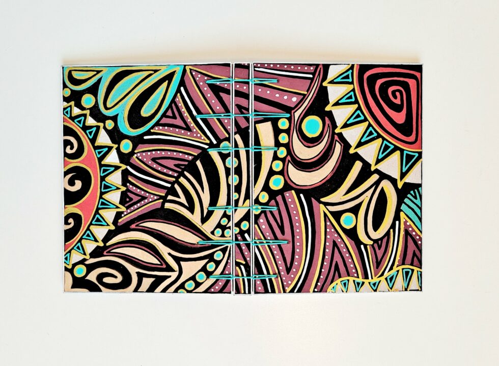La reliure de Mes p’tits carnets personnalisés est cousue main, elle est apparente à l’extérieur et à l’intérieur du carnet, c’est une reliure appelée reliure secrète belge ou encore reliure Criss-cross, technique inventée en 1985 par Anne Goy. Cette reliure est l’assemblage des 3 parties de la couverture (recto, dos, verso) par une couture entrecroisée qui donne un résultat à la fois solide et esthétique et permet une ouverture à plat du carnet. Les points de perçage de la reliure peuvent varier en nombre et en distance pour créer des variantes et la couleur du fil s’harmonise avec le motif peint.