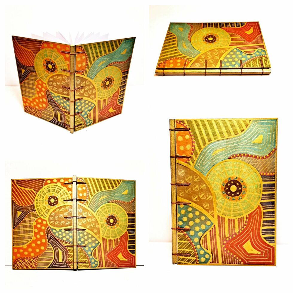 Livre d’or “Mélie Mélo”, couverture en bois peint à la main, création motif original, reliure secrète Belge, format A5, 32 pages cousues, papier blanc 160g.