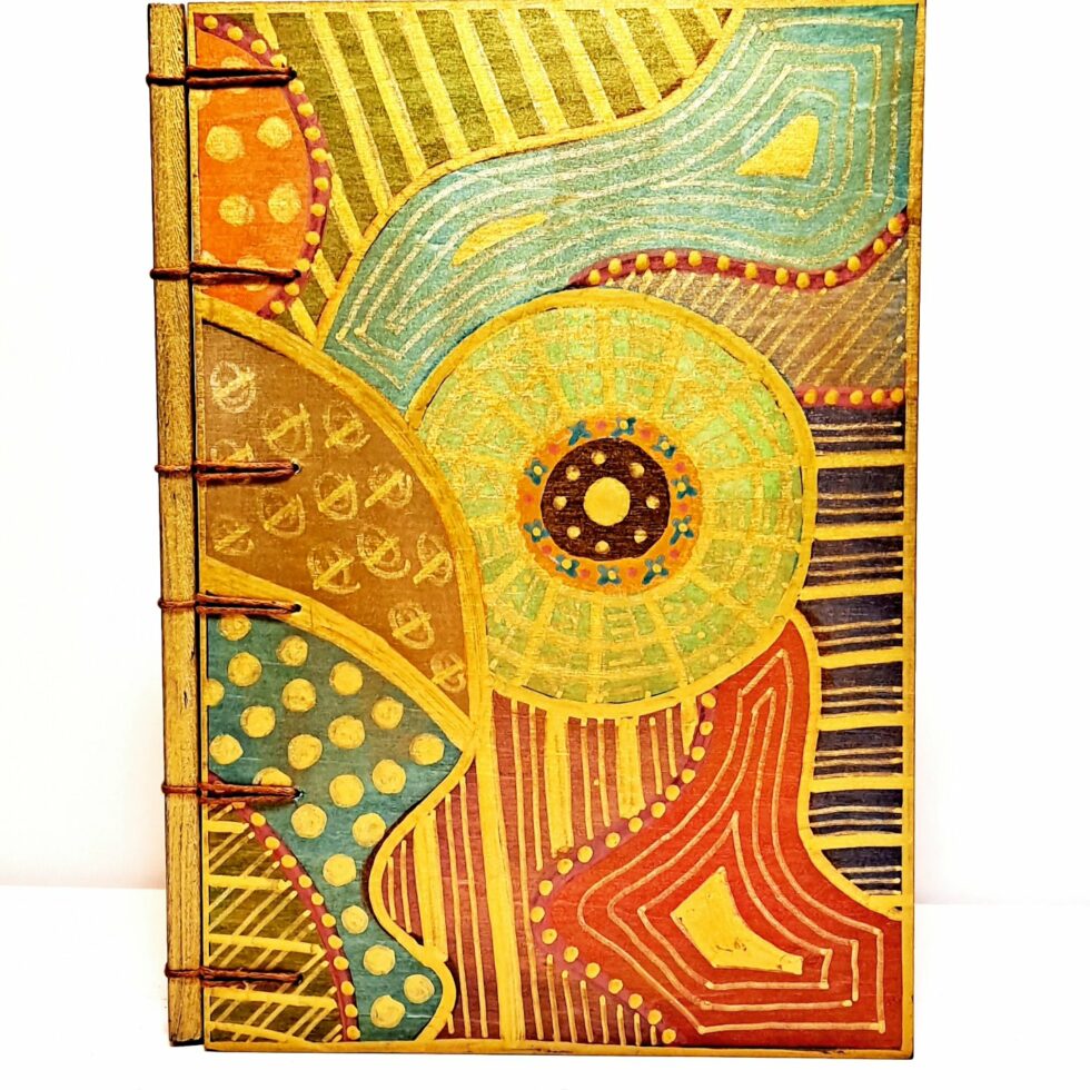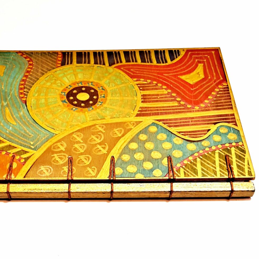 J’ai opté pour des feuilles de bois dans la fabrication de Mes p’tits carnets car c’est le matériau le mieux adapté que j’ai trouvé pour être à la fois le support de mes peintures sans gondoler, se craqueler ou s’écailler et pour assurer une bonne résistance au carnet. J’ai choisi de ne pas utiliser de colle car le collage ne répond pas à mon envie de tendre le plus possible vers une éco-conception de Mes p’tits carnets et complexifie le processus de recyclage des papiers et des cartons, même à très faible dose. C’est pourquoi la couverture et les pages de Mes p’tits carnets sont 100% cousues !